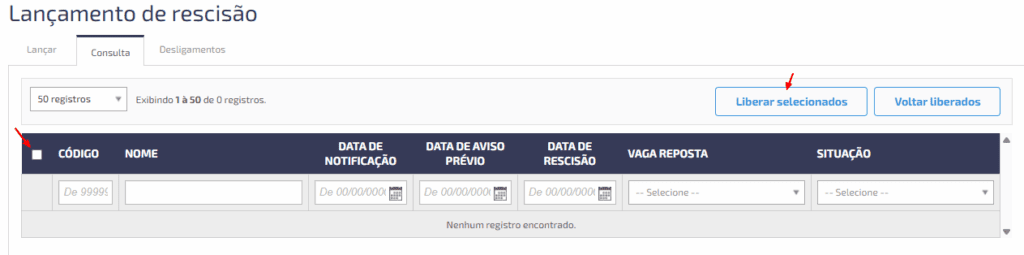• Na aba consulta, selecionar a rescisão e clicar em liberar para formalizar a solicitção
